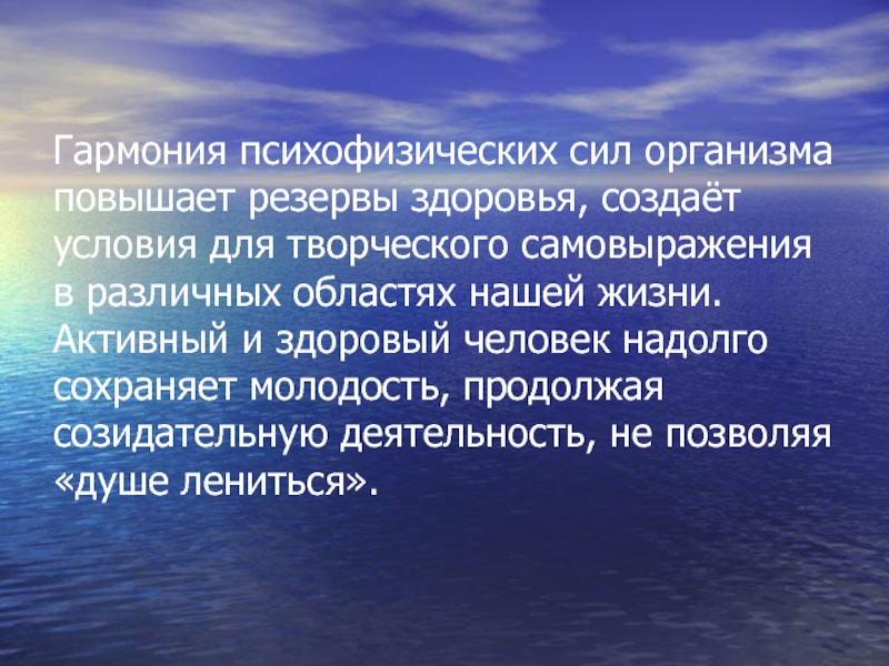 Слайд 12Гармония психофизических сил организма повышает резервы здоровья, создаёт условия для творческого