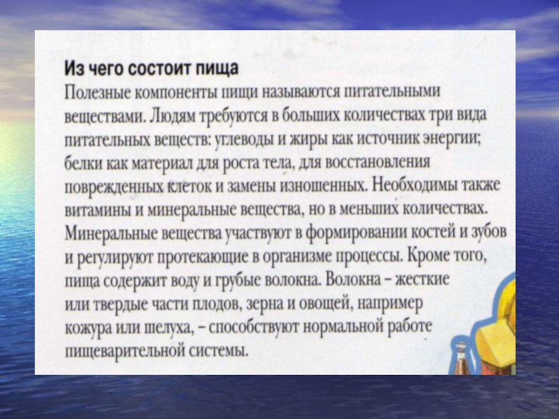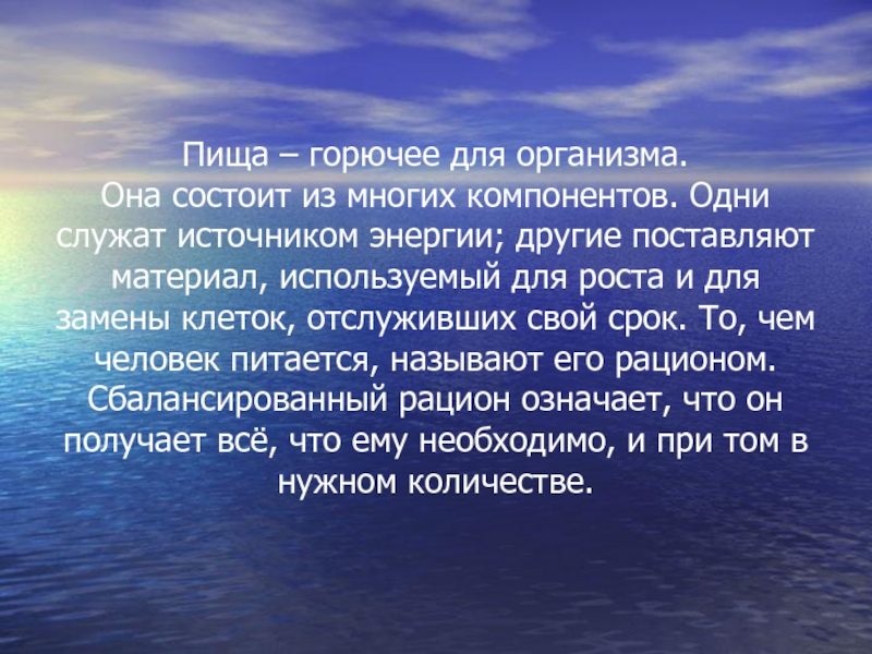 источником энергии; другие поставляют материал, используемый для роста и для замены клеток, отслуживших свой срок. То, чем человек питается, называют его рационом. Сбалансированный рацион означает, что он получает всё, что ему необходимо, и при том в нужном количестве.