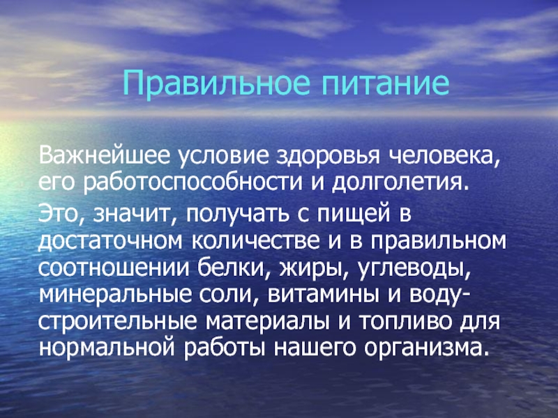 с пищей в достаточном количестве и в правильном соотношении белки, жиры, углеводы, минеральные соли, витамины и воду- строительные материалы и топливо для нормальной работы нашего организма.