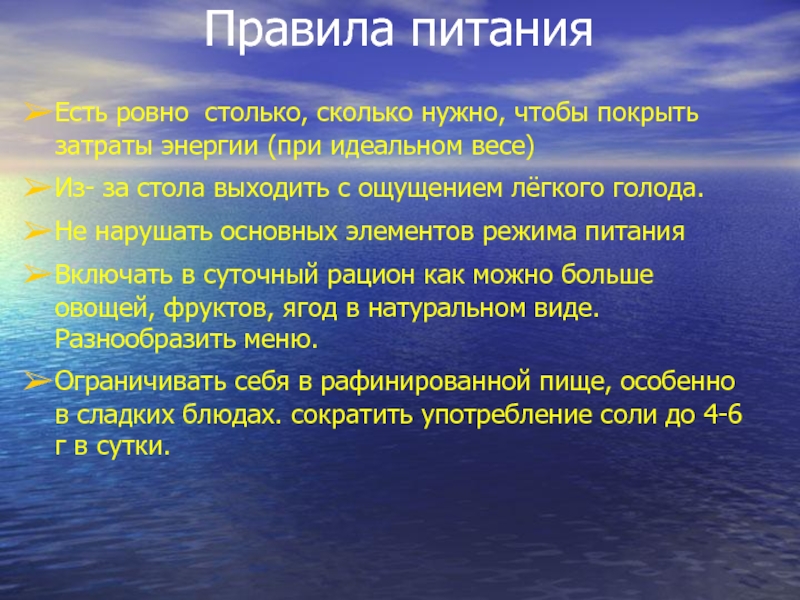 Ограничивать себя в рафинированной пище, особенно в сладких блюдах. сократить употребление соли до 4-6 г в сутки.
