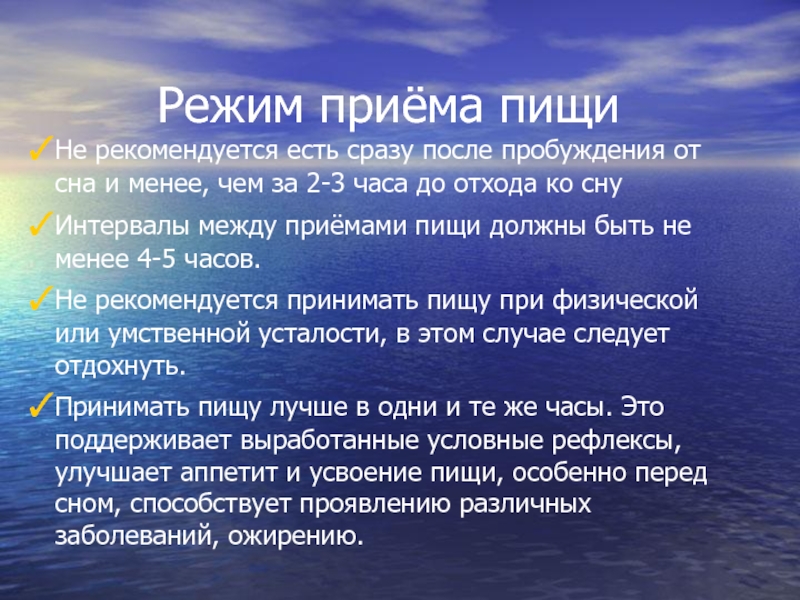 Принимать пищу лучше в одни и те же часы. Это поддерживает выработанные условные рефлексы, улучшает аппетит и усвоение пищи, особенно перед сном, способствует проявлению различных заболеваний, ожирению.