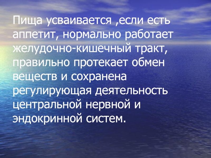 Слайд 20Пища усваивается ,если есть аппетит, нормально работает желудочно-кишечный тракт, правильно протекает
