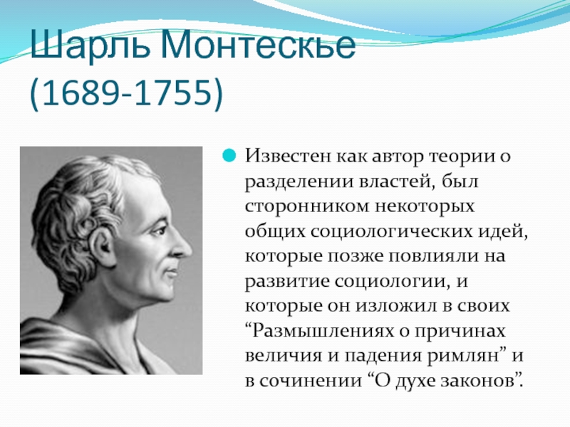 некоторых общих социологических идей, которые позже повлияли на развитие социологии, и которые он изложил в своих “Размышлениях о причинах величия и падения римлян” и в сочинении “О духе законов”.