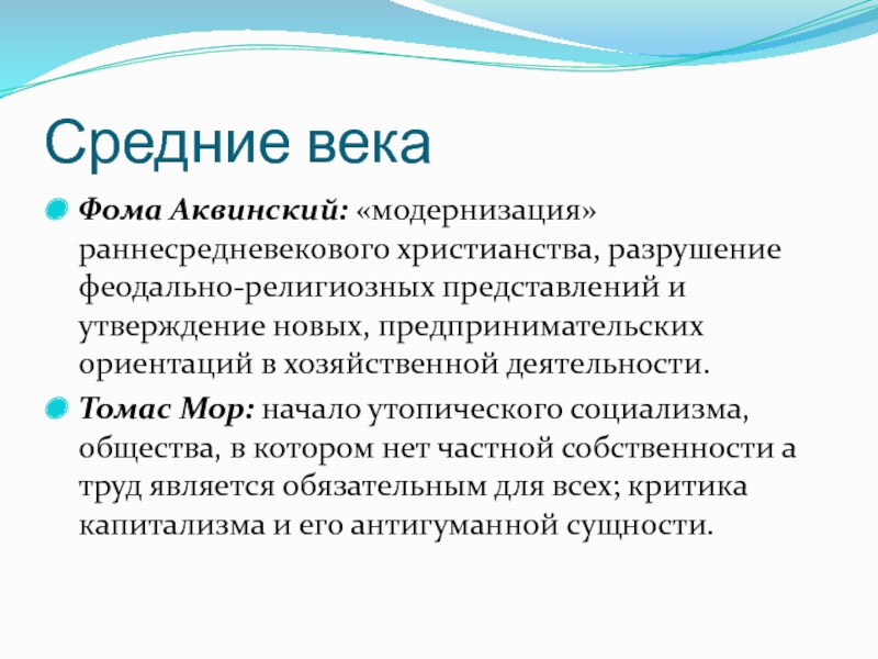 Томас Мор: начало утопического социализма, общества, в котором нет частной собственности а труд является обязательным для всех; критика капитализма и его антигуманной сущности.