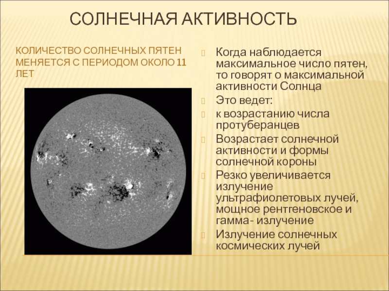 наблюдается максимальное число пятен, то говорят о максимальной активности Солнца