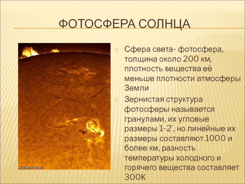 Зернистая структура фотосферы называется гранулами, их угловые размеры 1-2’, но линейные их размеры составляют 1000 и более км, разность температуры холодного и горячего вещества составляет 300К