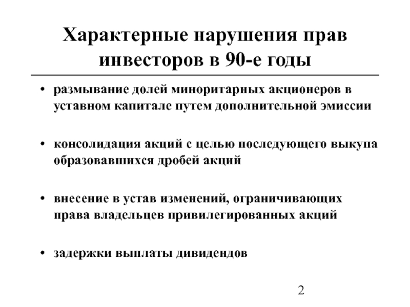 Слайд 2Характерные нарушения прав инвесторов в 90-е годы