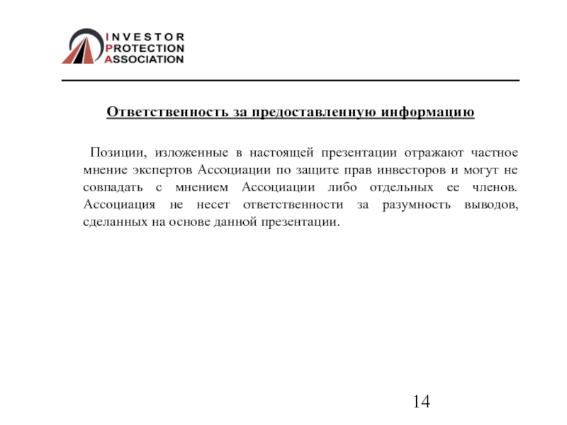 экспертов Ассоциации по защите прав инвесторов и могут не совпадать с мнением Ассоциации либо отдельных ее членов. Ассоциация не несет ответственности за разумность выводов, сделанных на основе данной презентации.