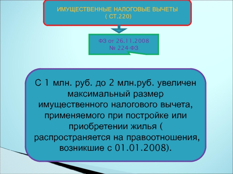руб. до 2 млн.руб. увеличен максимальный размер имущественного налогового вычета, применяемого при постройке или приобретении жилья ( распространяется на правоотношения, возникшие с 01.01.2008).