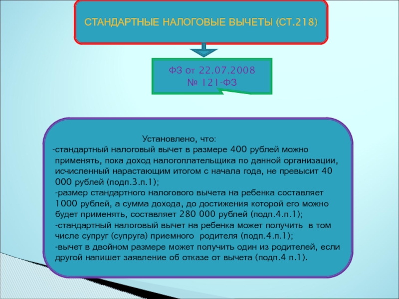 Слайд 8СТАНДАРТНЫЕ НАЛОГОВЫЕ ВЫЧЕТЫ (СТ.218)