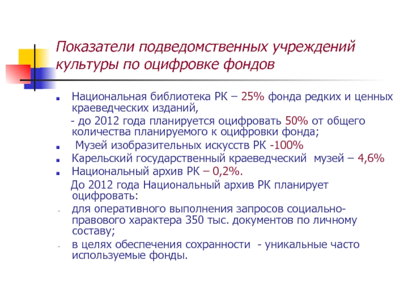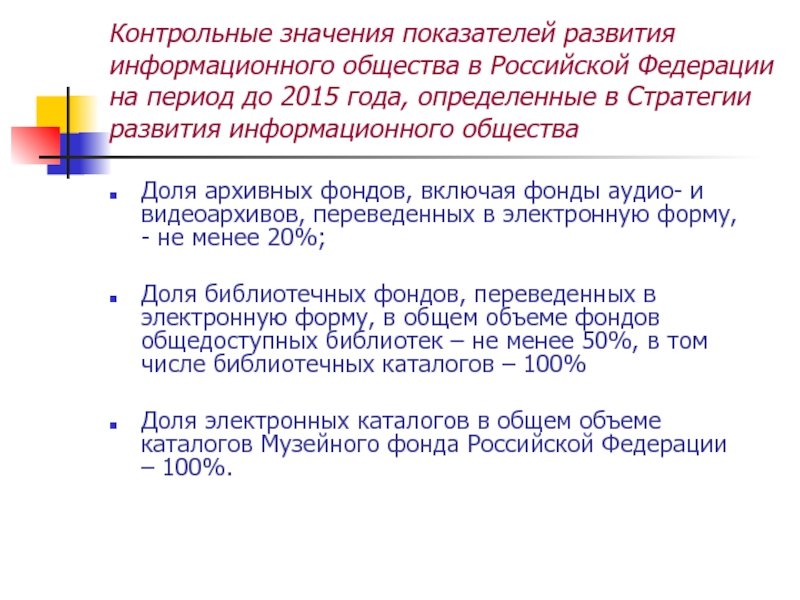 Доля архивных фондов, включая фонды аудио- и видеоархивов, переведенных в электронную форму, - не менее 20%;