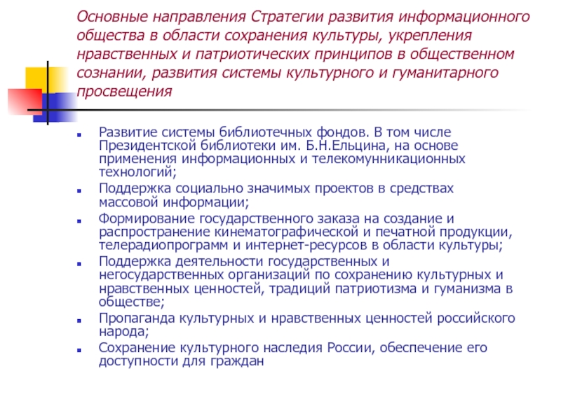Развитие системы библиотечных фондов. В том числе Президентской библиотеки им. Б.Н.Ельцина, на основе применения информационных и телекомунникационных технологий;