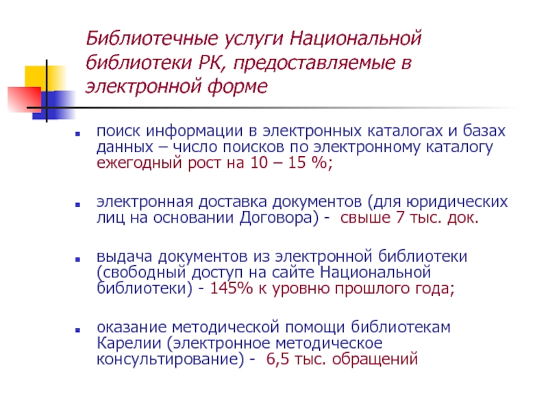 проект «Электронные полнотекстовые ресурсы для пользователей Национальной библиотекой РК» развивает сервисы Электронной библиотеки и обеспечивает трехуровневый доступ к электронным полнотекстовым библиотечным ресурсам;