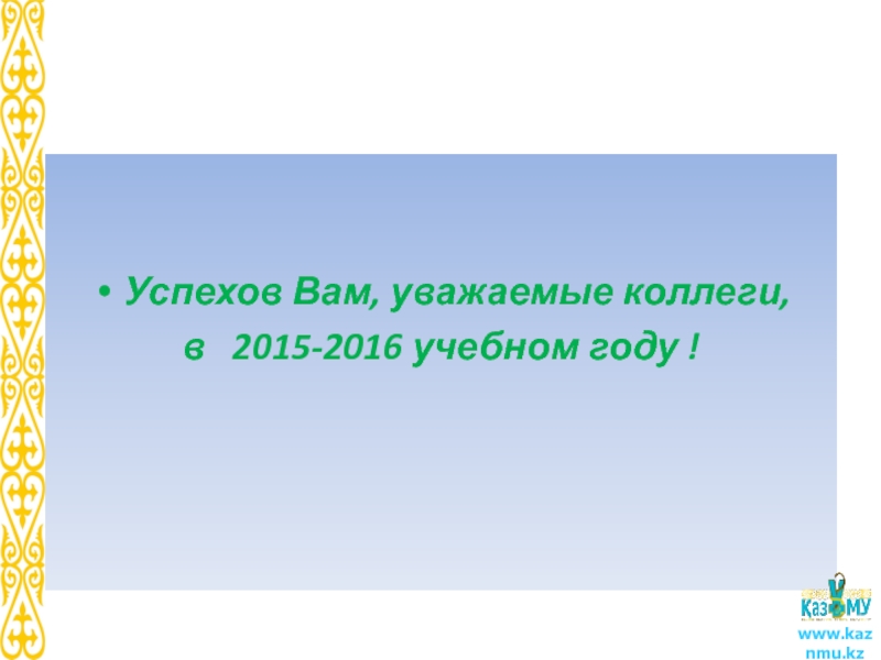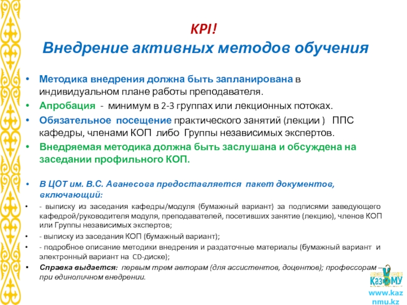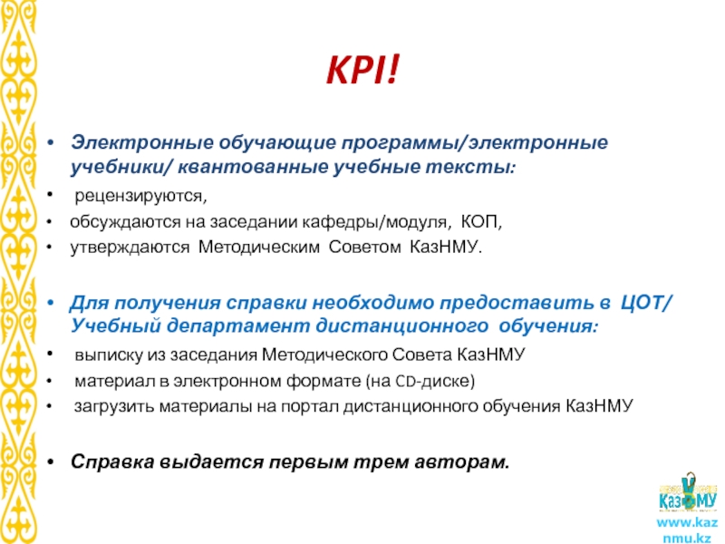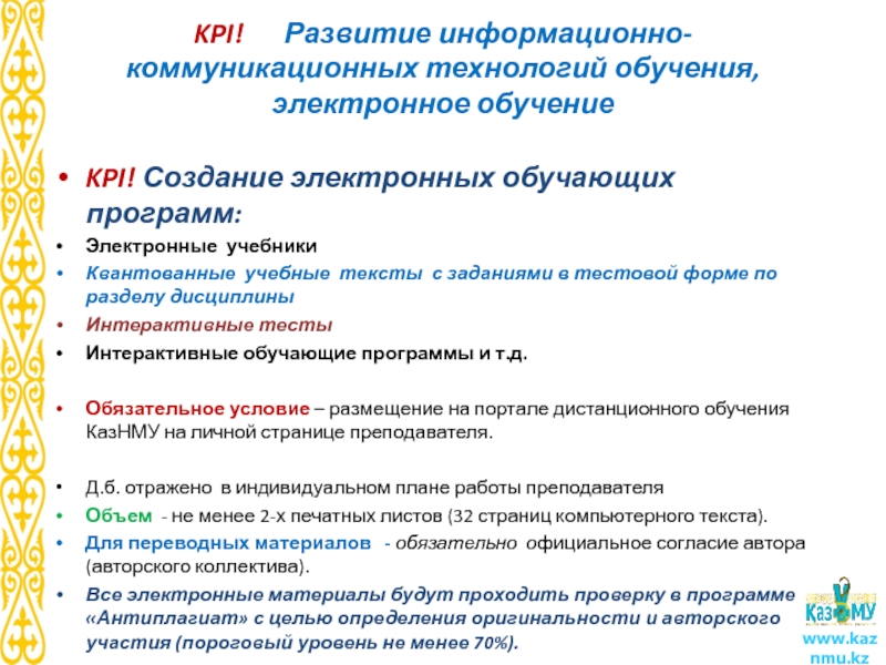 Обязательное условие – размещение на портале дистанционного обучения КазНМУ на личной странице преподавателя.