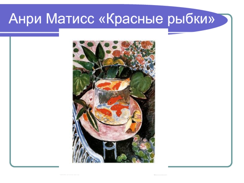 В центре картины красные рыбки. Диковатый цвет, непривычный для восприятия. Использует цвета: красный, зелёный, фиолетовый.
