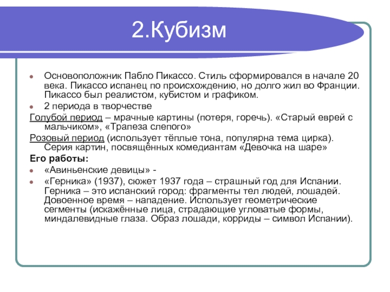 «Герника» (1937), сюжет 1937 года – страшный год для Испании. Герника – это испанский город: фрагменты тел людей, лошадей. Довоенное время – нападение. Использует геометрические сегменты (искажённые лица, страдающие угловатые формы, миндалевидные глаза. Образ лошади, корриды – символ Испании).