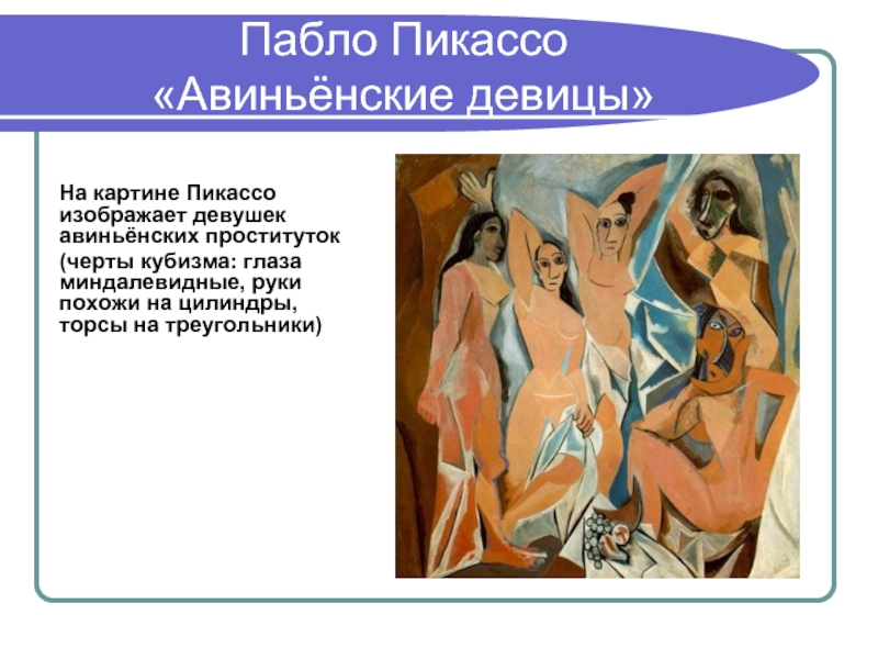 Основоположник Пабло Пикассо. Стиль сформировался в начале 20 века. Пикассо