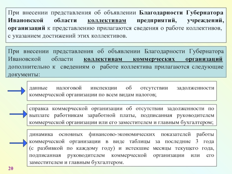 Для представления к награждению наградами Ивановской области руководителей, заместителей руководителей, главных бухгалтеров и главных экономистов коммерческих организаций дополнительно прилагаются: