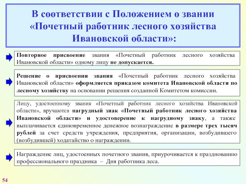 Повторное присвоение звания «Почетный работник лесного хозяйства Ивановской области» одному лицу не допускается.