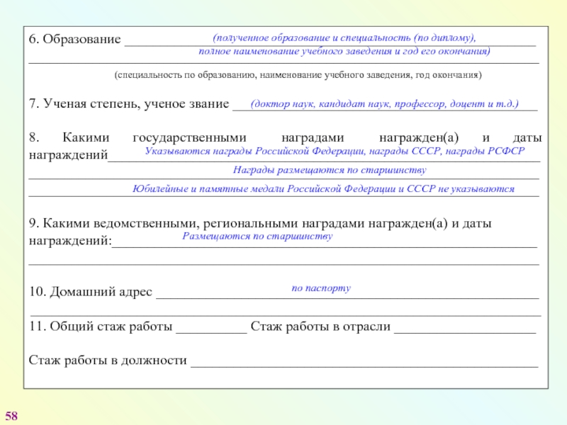 Все пункты должны соответствовать данным паспорта, военного билета, трудовой книжки, дипломов об образовании
