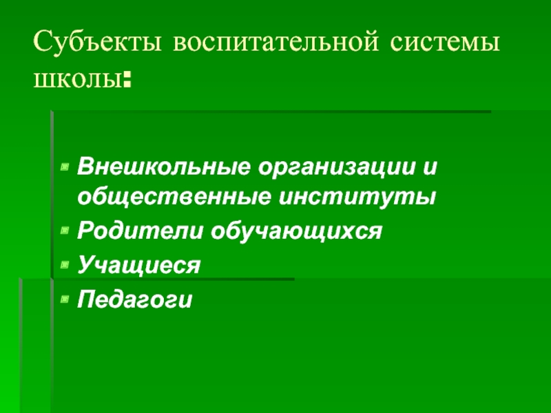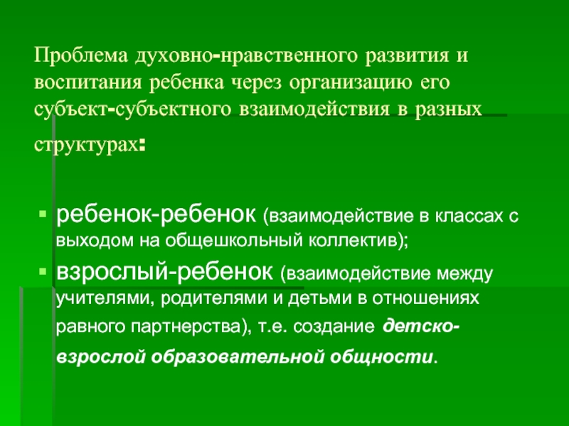 взрослый-ребенок (взаимодействие между учителями, родителями и детьми в отношениях равного партнерства), т.е. создание детско-взрослой образовательной общности.