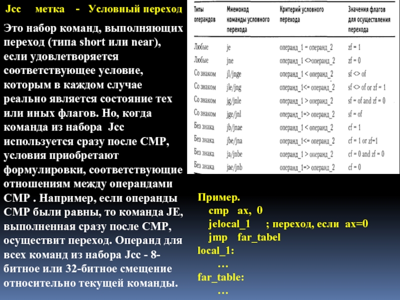 Это набор команд, выполняющих переход (типа short или nеаг), если удовлетворяется соответствующее условие, которым в каждом случае реально является состояние тех или иных флагов. Но, когда команда из набора Jсс используется сразу после СМР, условия приобретают формулировки, соответствующие отношениям между операндами СМР . Например, если операнды СМР были равны, то команда JE, выполненная сразу после СМР, осуществит переход. Операнд для всех команд из набора Jсс - 8-битное или 32-битное смещение относительно текущей команды.