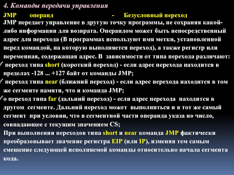 JMP передает управление в другую точку программы, не сохраняя какой-либо информации для возврата. Операндом может быть непосредственный адрес для перехода (В программах используют имя метки, установленной перед командой, на которую выполняется переход), а также регистр или переменная, содержащая адрес. В зависимости от типа перехода различают: