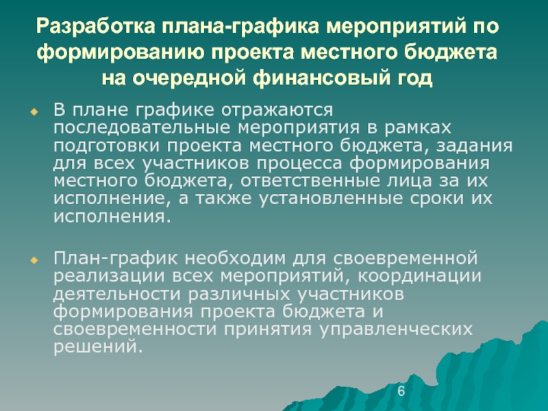 План-график необходим для своевременной реализации всех мероприятий, координации деятельности различных участников формирования проекта бюджета и своевременности принятия управленческих решений.
