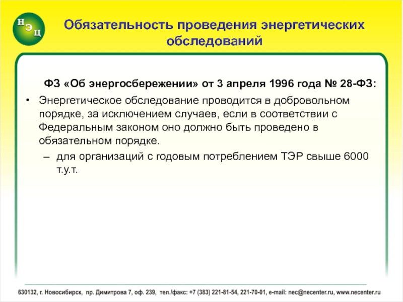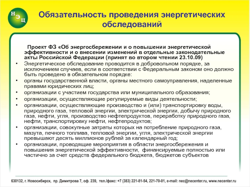 Энергетическое обследование проводится в добровольном порядке, за исключением случаев, если в соответствии с Федеральным законом оно должно быть проведено в обязательном порядке: