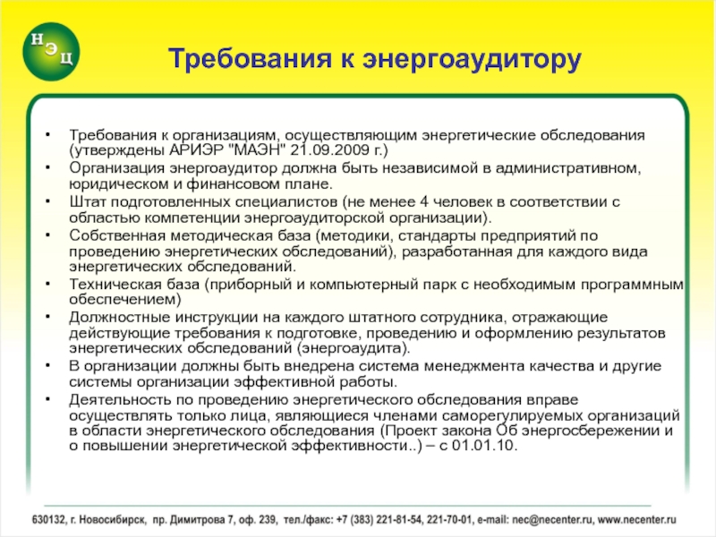 Требования к организациям, осуществляющим энергетические обследования (утверждены АРИЭР "МАЭН"