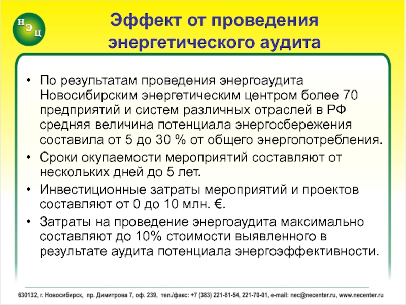 Затраты на проведение энергоаудита максимально составляют до 10% стоимости выявленного в результате аудита потенциала энергоэффективности.