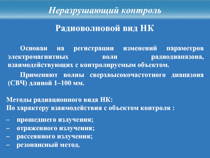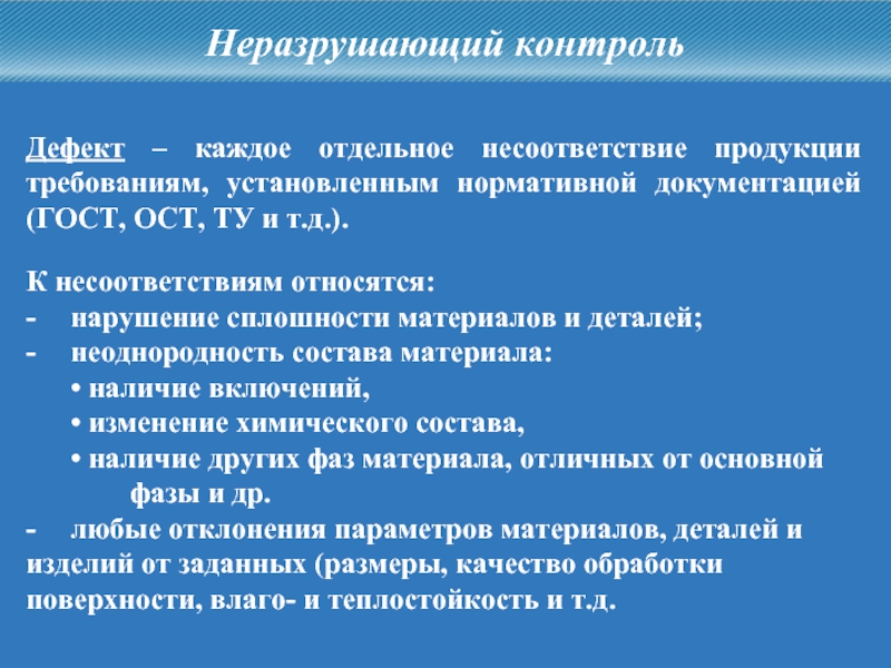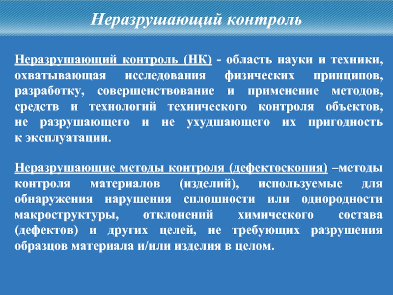 Неразрушающие методы контроля (дефектоскопия) –методы контроля материалов (изделий), используемые для обнаружения нарушения сплошности или однородности макроструктуры, отклонений химического состава (дефектов) и других целей, не требующих разрушения образцов материала и/или изделия в целом.