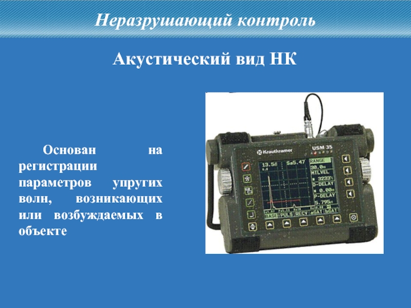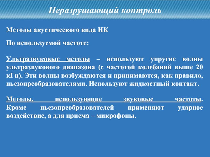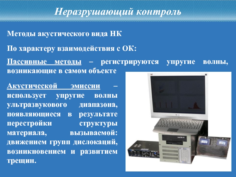 Акустической эмиссии – использует упругие волны ультразвукового диапазона, появляющиеся в результате перестройки структуры материала, вызываемой: движением групп дислокаций, возникновением и развитием трещин.