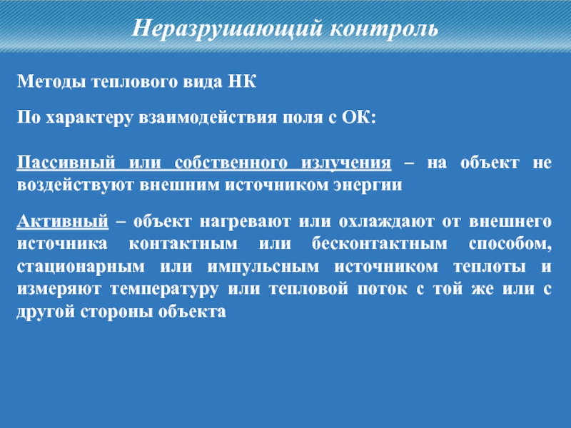 Активный – объект нагревают или охлаждают от внешнего источника контактным или бесконтактным способом, стационарным или импульсным источником теплоты и измеряют температуру или тепловой поток с той же или с другой стороны объекта