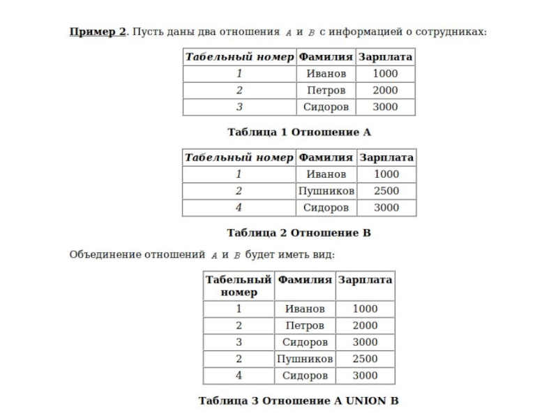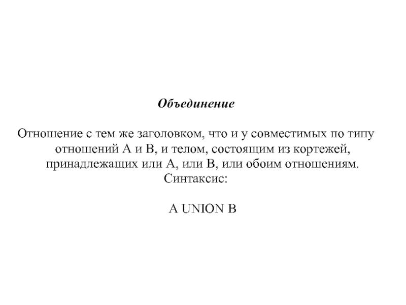 отношений A и B, и телом, состоящим из кортежей, принадлежащих или A, или B, или обоим отношениям.