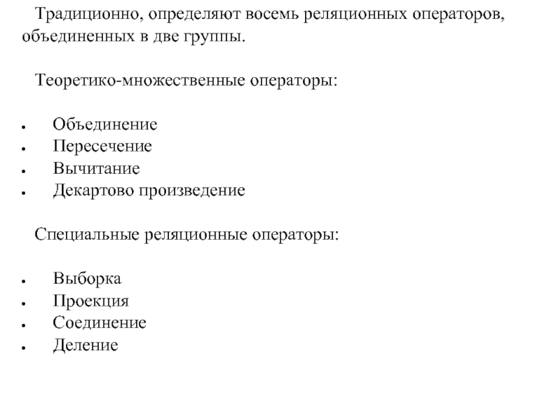Слайд 24Традиционно, определяют восемь реляционных операторов, объединенных в две группы.