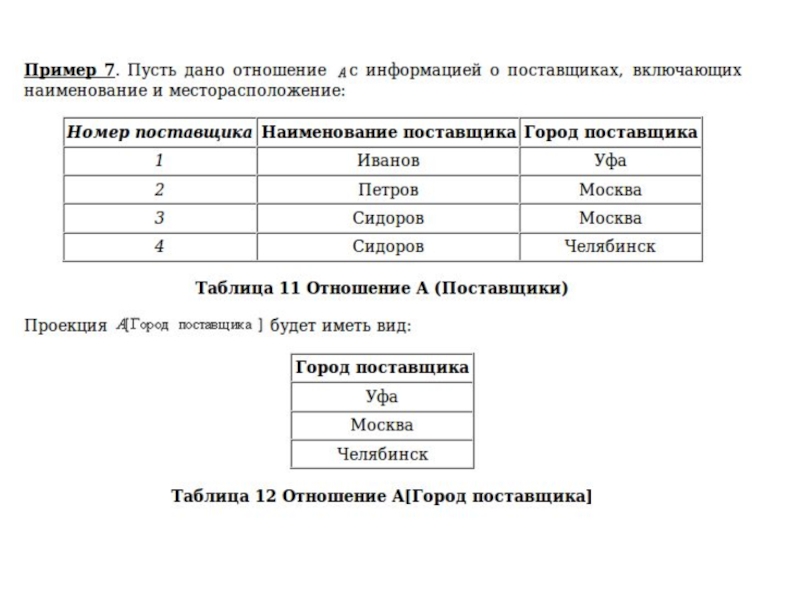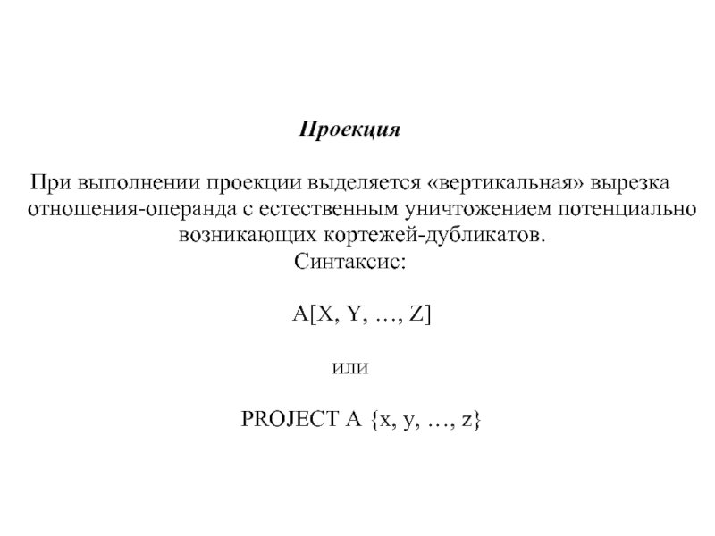 При выполнении проекции выделяется «вертикальная» вырезка отношения-операнда с естественным уничтожением потенциально