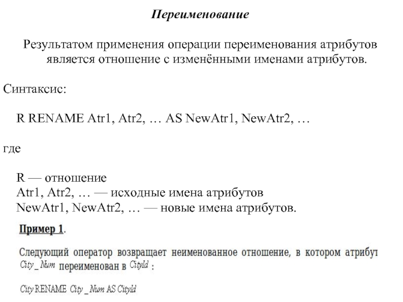 Результатом применения операции переименования атрибутов является отношение с изменёнными именами атрибутов.