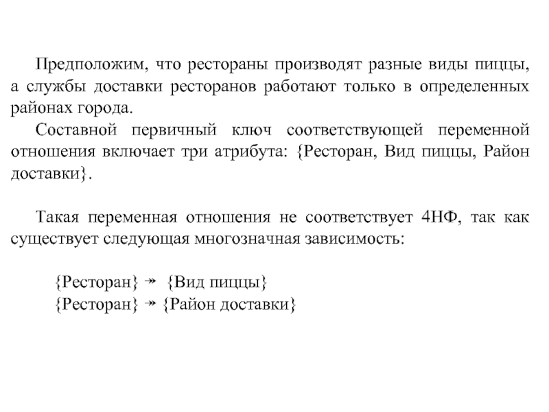 Составной первичный ключ соответствующей переменной отношения включает три атрибута: {Ресторан, Вид пиццы, Район доставки}.