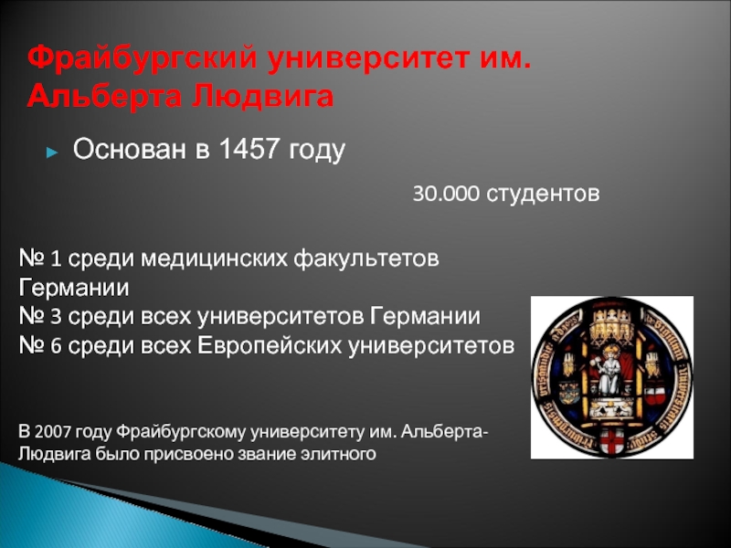 В 2007 году Фрайбургскому университету им. Альберта-Людвига было присвоено звание элитного