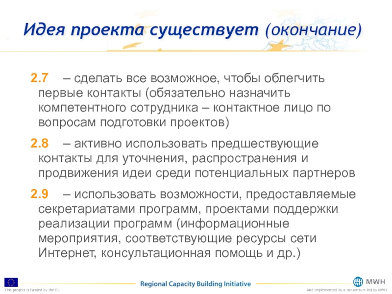 облегчить первые контакты (обязательно назначить компетентного сотрудника – контактное лицо по вопросам подготовки проектов)