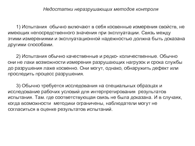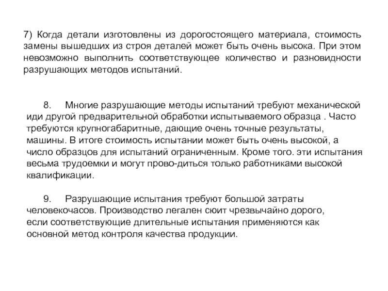 8. Многие разрушающие методы испытаний требуют механической иди другой предварительной обработки испытываемого образца . Часто требуются крупногабаритные, дающие очень точные результаты, машины. В итоге стоимость испытании может быть очень высокой, а число образцов для испытаний ограниченным. Кроме того. эти испытания весьма трудоемки и могут проводиться только работниками высокой квалификации.