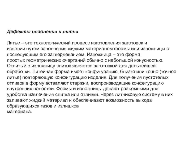простых геометрических очертаний обычно с небольшой конусностью. Отлитый в изложницу слиток является заготовкой для дальнейшей обработки. Литейная форма имеет конфигурацию, близко или точно (точное литье) повторяющую конфигурацию изделия. Для получения пустотелых отливок в форму вставляют стержни, воспроизводящие конфигурацию внутренних полостей. Формы и изложницы делают разъемными для удобства извлечения слитка или отливки. Через литниковую систему в них заливают жидкий материал и обеспечивают возможность выхода образующихся газов и излишков