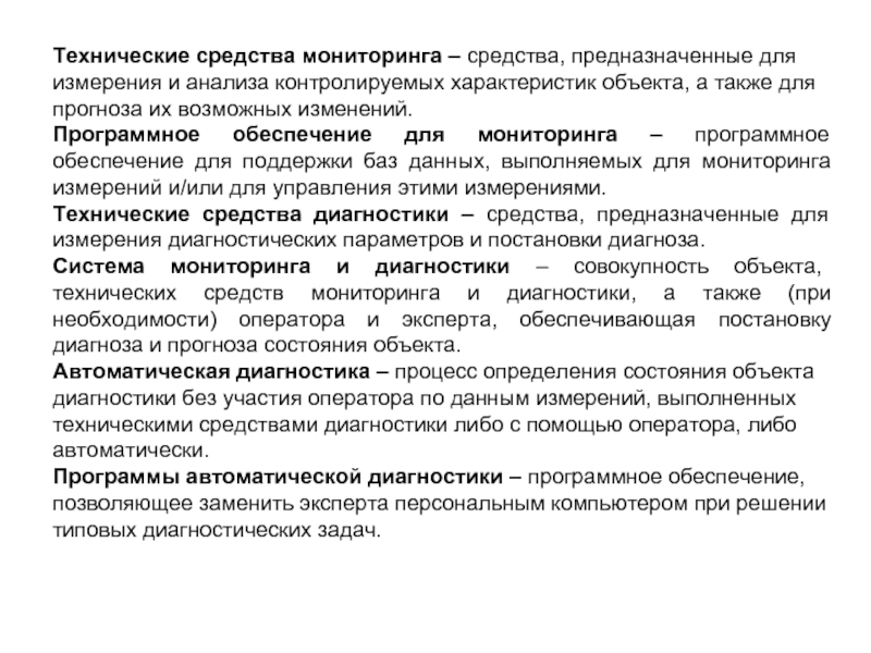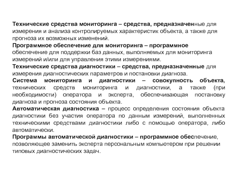 Система мониторинга и диагностики – совокупность объекта, технических средств мониторинга и диагностики, а также (при необходимости) оператора и эксперта, обеспечивающая постановку диагноза и прогноза состояния объекта.