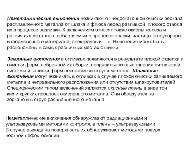 Слайд 61Неметаллические включения возникают от недостаточной очистки зеркала расплавленного металла от шлака