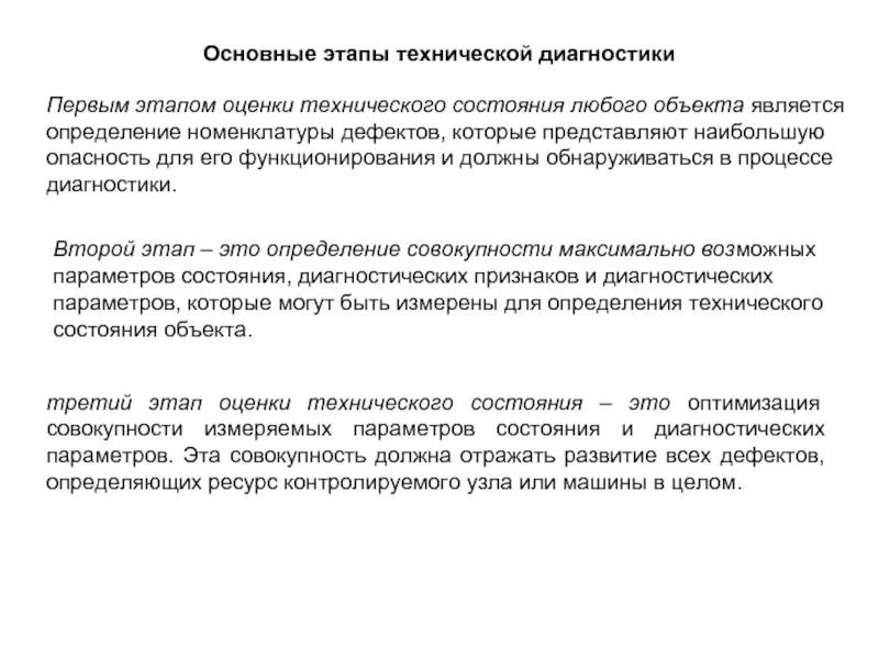 Второй этап – это определение совокупности максимально возможных параметров состояния, диагностических признаков и диагностических параметров, которые могут быть измерены для определения технического состояния объекта.