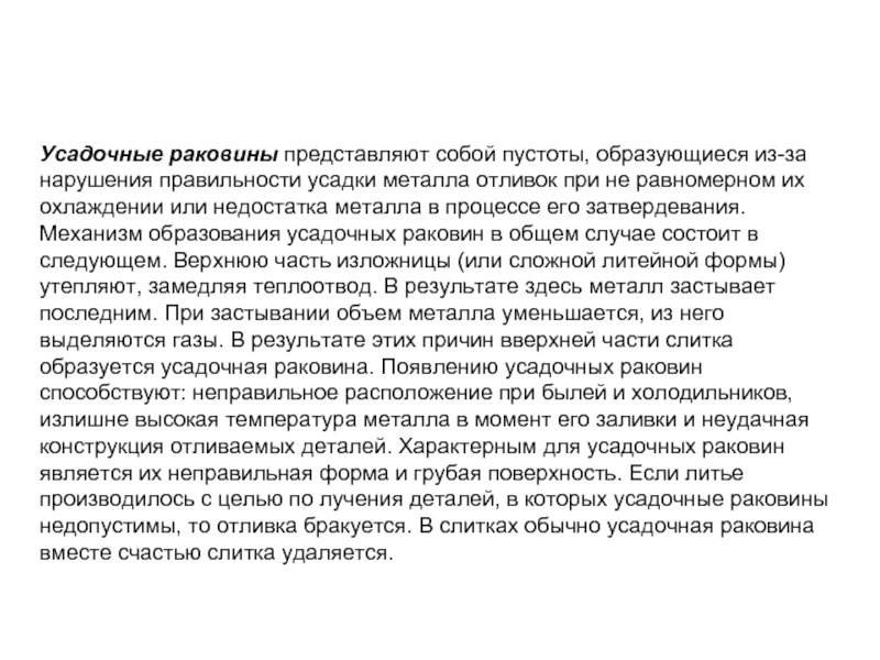 Слайд 62Усадочные раковины представляют собой пустоты, образующиеся из-за нарушения правильности усадки металла