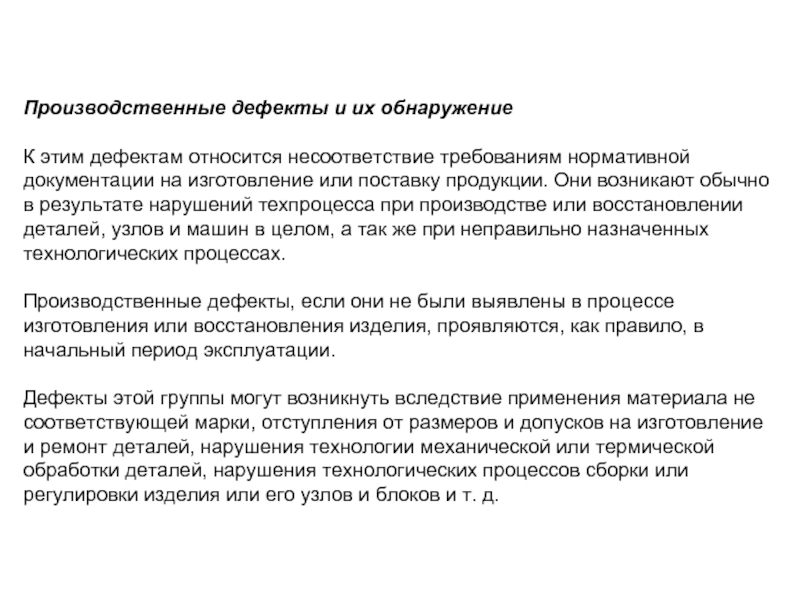 Производственные дефекты, если они не были выявлены в процессе изготовления или восстановления изделия, проявляются, как правило, в начальный период эксплуатации.