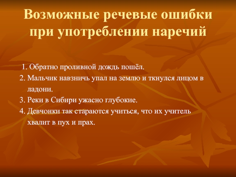 Слайд 10Возможные речевые ошибки при употреблении наречий