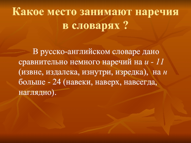 В русско-английском словаре дано сравнительно немного наречий на и - 11 (извне, издалека, изнутри, изредка), на н больше - 24 (навеки, наверх, навсегда, наглядно).